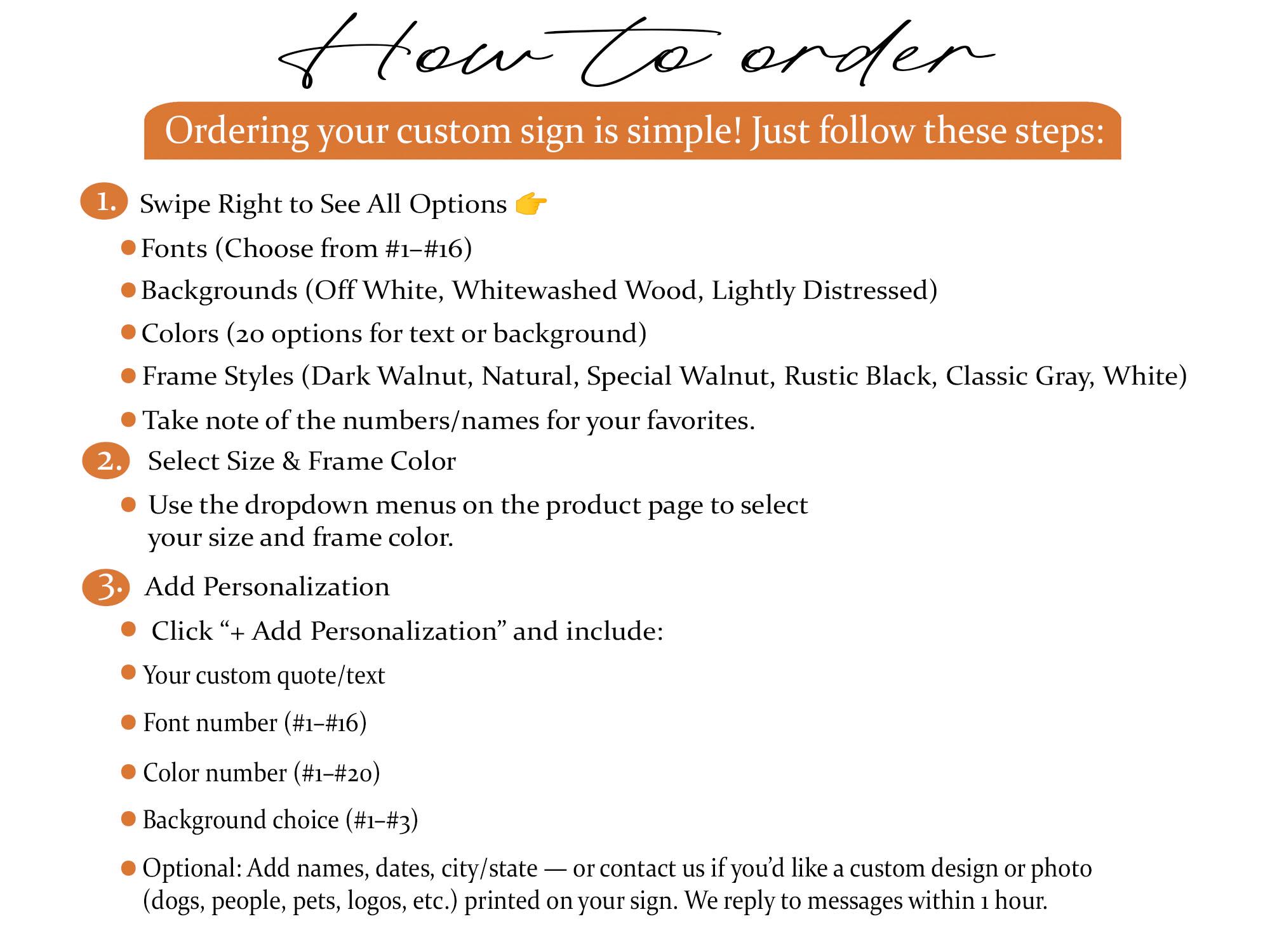 Our signs are made to order with a processing time of 3-5 business days. We offer free FedEx Ground Shipping, and expedited FedEx Express Overnight Shipping is available for an additional fee (price varies by size). Please include your quote and preferred font in the personalization area, or feel free to contact us directly.