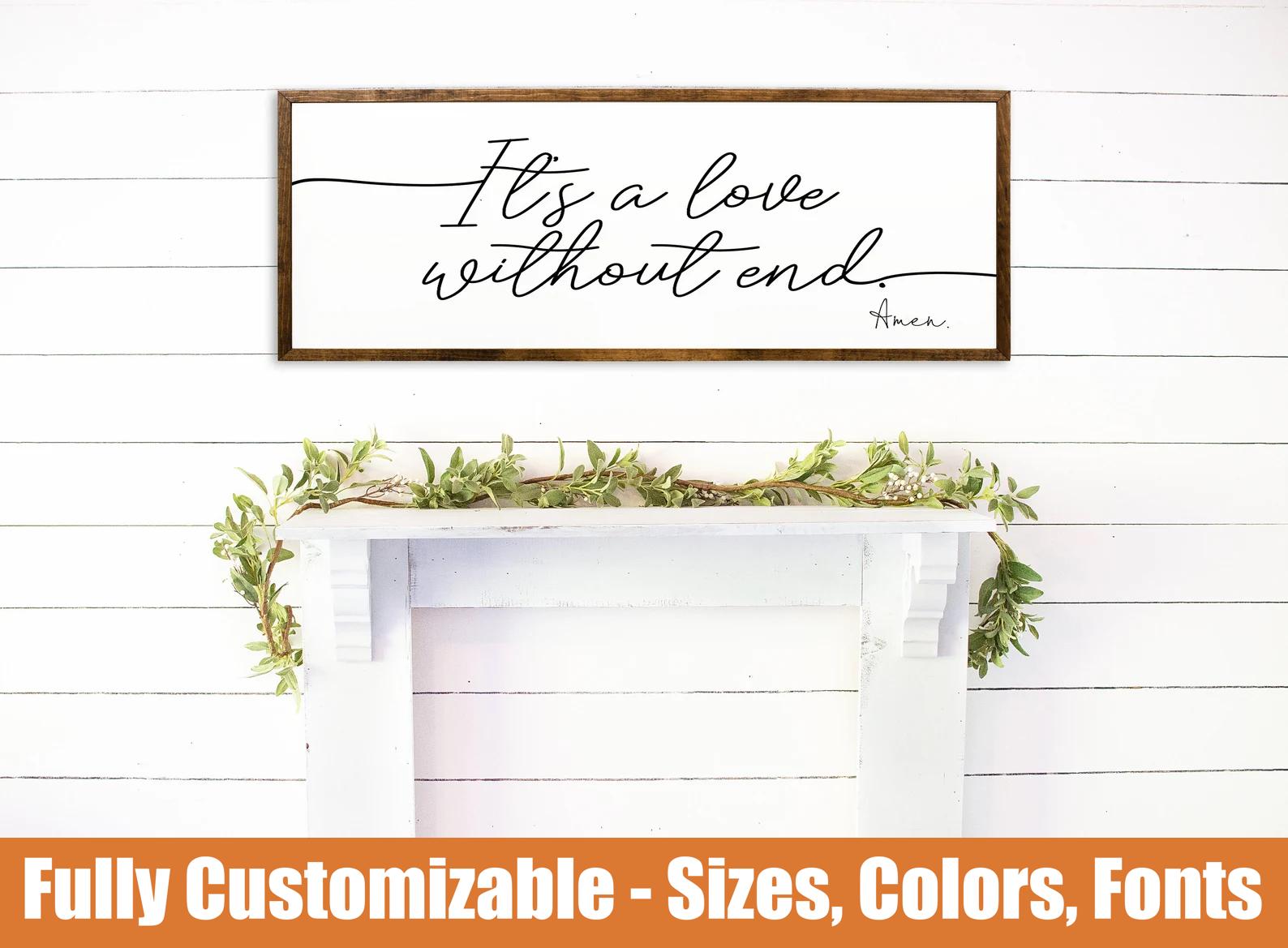 Immerse your space with the essence of boundless love using our "It's a Love Without End, Amen" sign. A touching sentiment, this sign serves as a beautiful testament to the infinite nature of love. It's perfect for celebrating a love-filled relationship or enhancing a romantic or family-oriented space.
